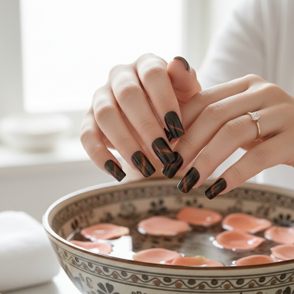 Wähle im Zweifelsfall immer die kleinere Größe. Wenn der Strip zu nah an oder auf der Nagelhaut klebt, kann er sich schneller lösen. Du kannst die Strips vor dem Aufkleben auch ganz vorsichtig mit den Fingern minimal in die Breite ziehen, um sie anzupassen.