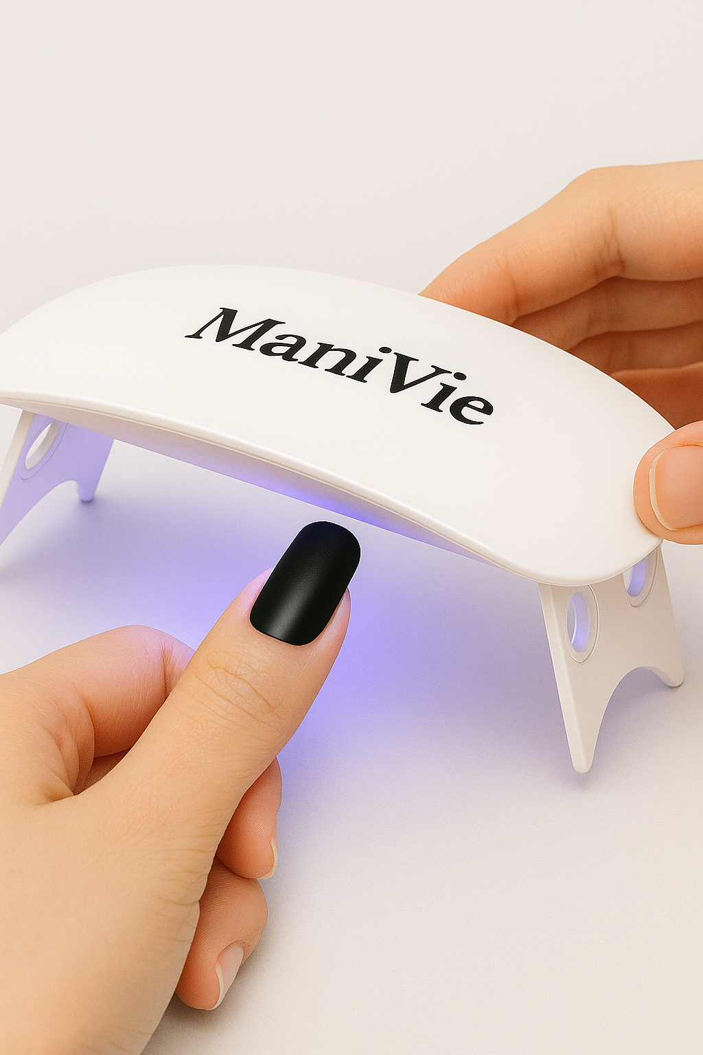 Lege deine Finger für 60 Sekunden unter die ManiVie UV-Lampe. Erst durch das Licht entfaltet der Strip seine volle Härte und den brillanten Gel-Glow.