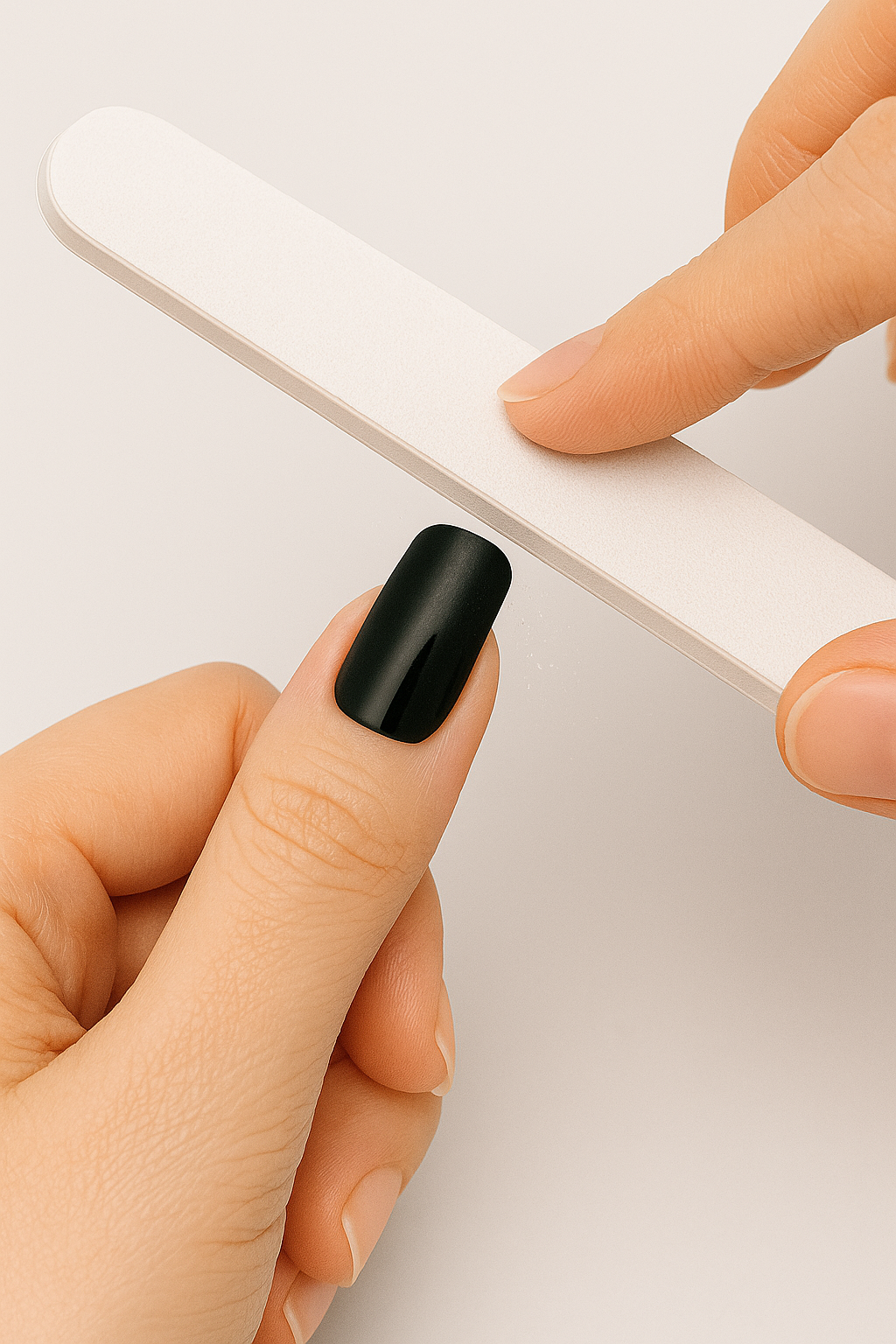 Kürze den Überstand grob mit einer Schere und feile den Rest in eine Richtung sanft nach unten ab, bis der Strip perfekt mit der Nagelkante abschließt.