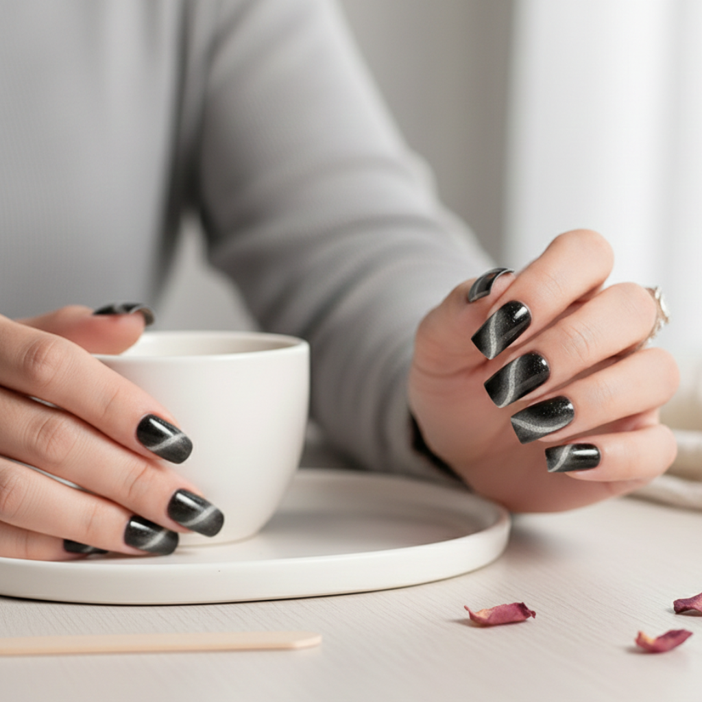 Wähle im Zweifelsfall immer die kleinere Größe. Wenn der Strip zu nah an oder auf der Nagelhaut klebt, kann er sich schneller lösen. Du kannst die Strips vor dem Aufkleben auch ganz vorsichtig mit den Fingern minimal in die Breite ziehen, um sie anzupassen.